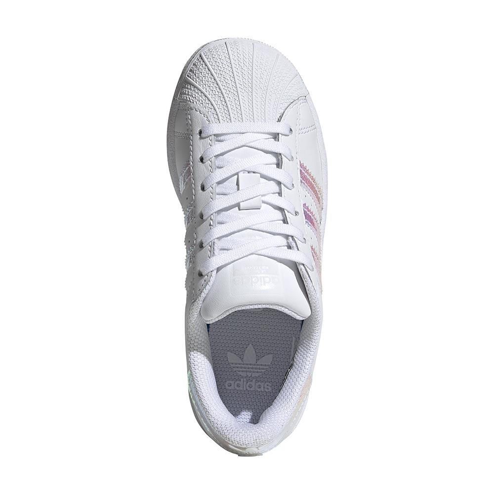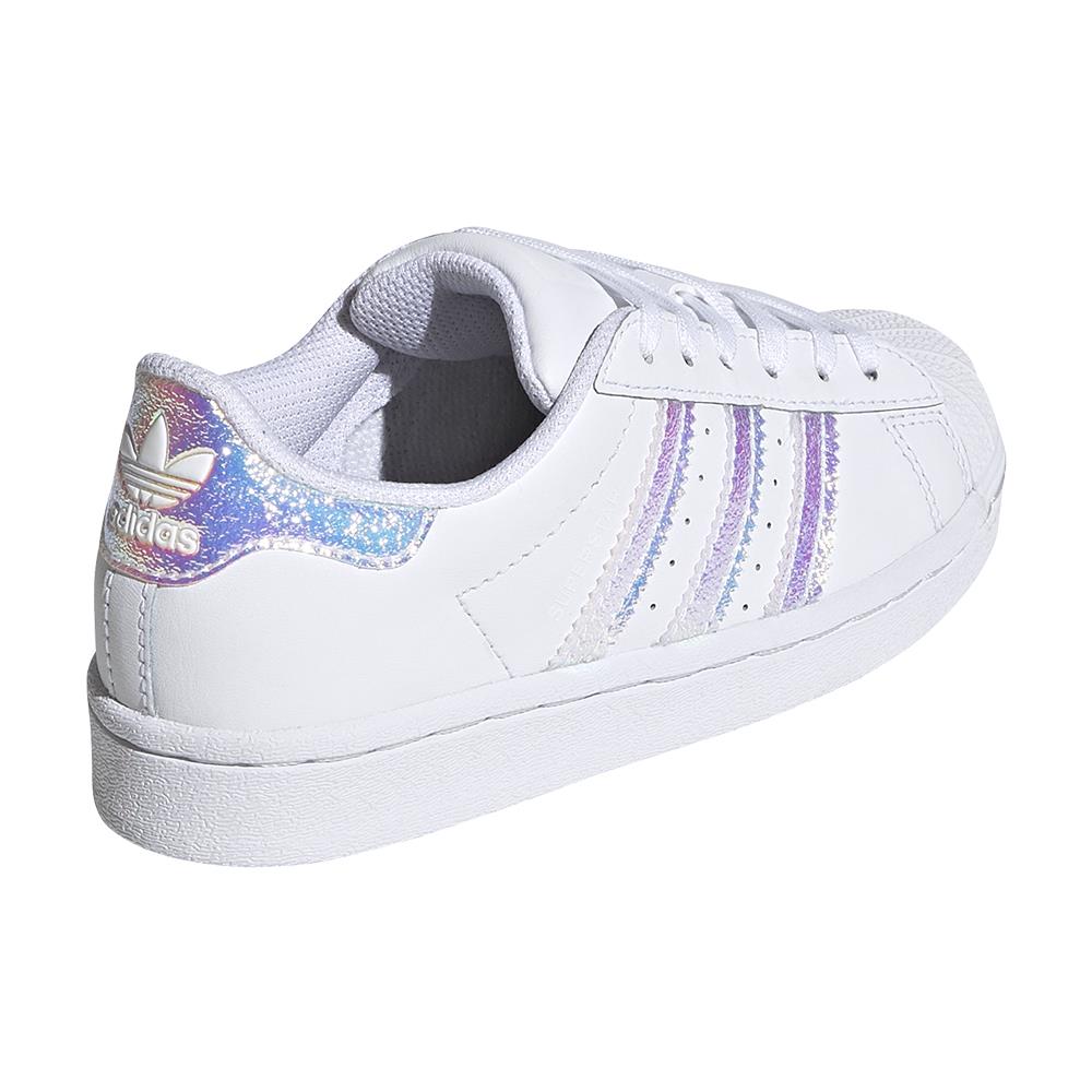 Iconic sneakers with a touch of shine. 50 years of success and change. From their debut to now, the adidas Superstar has been constantly evolving. First they conquered everyone as unbeatable basketball shoes on the hardwood, then they became a must-have on the feet of hip hop artists who crowned them queens of the underground scene. Today, absolute masters of street culture, they continue to be popular for their harmonious and casual style. This version for boys and girls passes the legend on to new generations. The iridescent details add a touch of shine to their fun, and the hook-and-loop closures make the model extremely easy to wear even alone. Regular fit, lace closure, leather upper, contoured Ortholite insole, iconic shell-toe sneaker, leather lining and adifit insole with length measurement, rubber outsole.