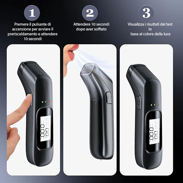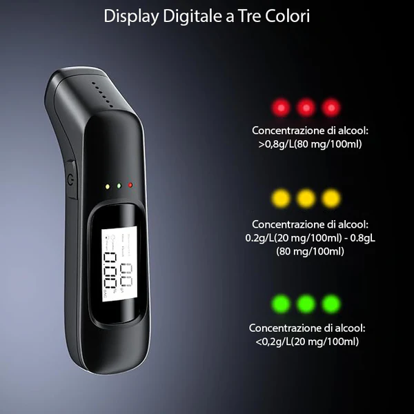 Equipped with a three-color warning system, the breathalyzer covers a testing range of 0.00%, 0.19% BAC, and 0.01.9g/L. If the detected alcohol level exceeds 0.03% BAC or 0.30g/L, the device emits a continuous beep, warning drivers not to drive.