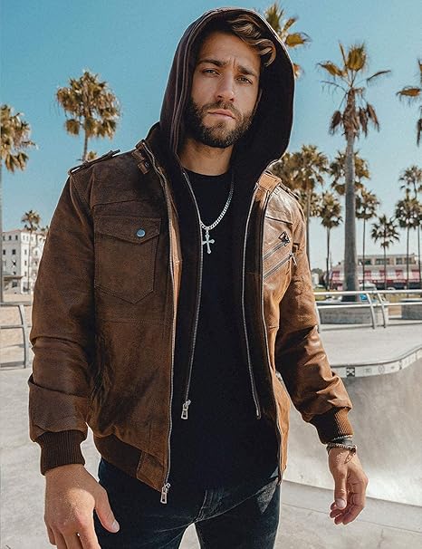 FLAVOR Men's Genuine Leather Jacket Hooded JacketFLAVOR Men’s Genuine Leather Jacket Hooded Jacket